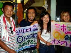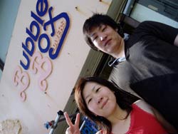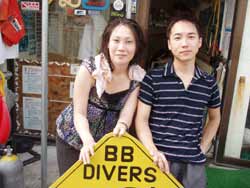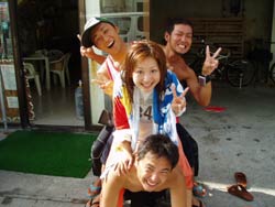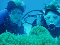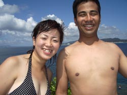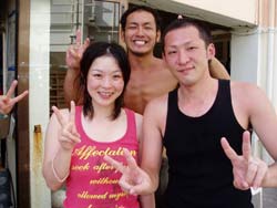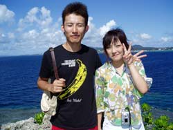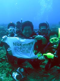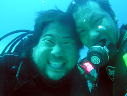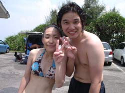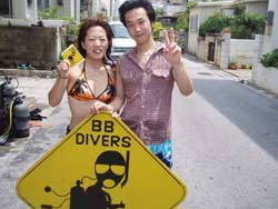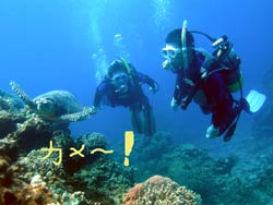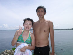 オセロ来沖!?体験ダイビング〜!!色白でかわいい留美子ちゃん&営業の仕事で日焼けしている真吾さんが1泊2日というタイトな沖縄旅行の中、遊びにきてくれました。2人とも最初から、じょうずオーラがでてた。海に入っても案の定余裕です。たくさんのサカナとたわむれる2人の姿がなんだかほほえましかったなぁ〜。ニモやニモベイビーそしてニモブリーフもチェックし、スイスイ泳いで、観音様に願い事、更に狭い穴をくぐったりもしちゃった!初めてのダイビングはどうでしたか?このページをみる頃はきっとお仕事再開しているかと思うけど、ファイト!だぞ!仕事につかれたらいつでも沖縄に遊びに来いよ〜! |