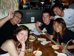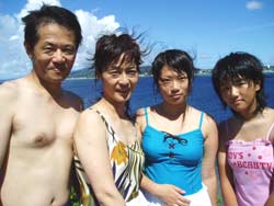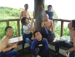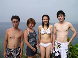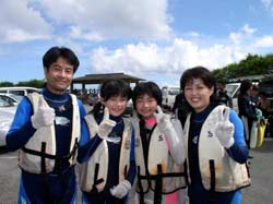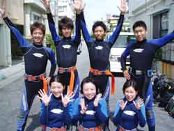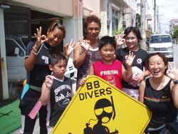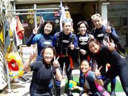 ゲスト4人&スタッフ3人のわいわいにぎやかダイビング〜メンバーは広島からお越しの山岡静樹木さん&陽子さん、大神公子ママ&憲太郎さんです。緊張いっぱいの女性陣、余裕の男性陣どちらも、りょうこのカタコトの日本語の説明をしっかり聞いてくれて、いざ海へ!最初やはり緊張モードでしたが、後半はもうニコニコスマイルですいすい泳いでましたね。男性陣ははじめから上手だったので、ほぼ放置状態(笑)みんなでオサカナにエサをあげたり、やわらかなサンゴにタッチしたり、集合写真をとったり、本物のニモ見れましたね。沖縄の海の中はいかがでしたか?また是非遊びに来て下さいね。またんめんそ〜れ〜! |