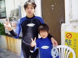 15:00 体験ダイビング☆杉山さん家族3名で 楽しみました。すっごくおとなしい兄弟でしたが 海の中はお父さんよりも 上手くサカナを捕まえようとがんばりました。「ニモにあいた〜〜い」という事で がんばって会いに行きましたが みんなスゴク上手かったですよ。ニモかわいかったね!自然に生きてる生ニモに会えたことを お父さんに ちゃんとお礼を行っておいてくださいよ!沖縄の一番の思い出になってくれていると おにーさんおねーさんは 嬉しいです・・・おじさんとおばさんかな?・・・また 大きくなったら 遊びに来てね。待ってるよ!写真が出来たら お母さんに自慢してね。 |