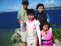 お昼から洞窟スノーケルをしに来てくれたのは静岡県から沖縄に着いたばかりのFamily。典央お父さん・ミカコお母さん・和香奈ちゃん・帆南ちゃんです!!お父さんは何をやるかも知らされずに水着に着替えさせられ、ちょっと戸惑った様子でのお越しでした(笑)最初はおとなしい感じの皆さんでしたが洞窟のキレイさやサカナの多さに声をあげながら楽しんでいましたね!!楽しい初・沖縄旅行のスタートはきれましたか??残りも楽しんでくださいね☆ |