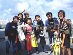 こんにちは〜今日は、石塚ファミリーが遊びにきてくれました。去年は真栄田岬のスノーケルに参加してくれた、石塚ファミリー。今年はいよいよダイビングに挑戦です。余裕の国雄パパ。ちょっぴり緊張の久美子ママ。海が大好き元気いっぱいのつばさくんとひろとくんです。練習をしてから海へGO!顔を水につけたところからかわいいお魚がお出迎えしてくれたね。えさを出すとたくさんのお魚がよってきたね。海の中から見る水面もキラキラととってもきれいでしたね。海の大好きなご家族、これからもマリンライフを楽しんでくださいね。(^^) |