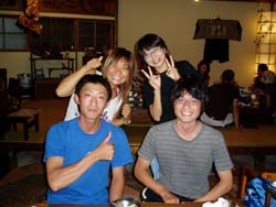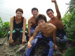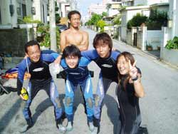 はいさーい!りょうこでーす。空は青空!海は穏やか最高!!そしてゲストも最高!愛知県からさわやかナイスガイ4人チームが遊びにきてくれました。メンバーは、橋本さん&竹内さん&大澤さん&高瀬さんです。体験ダイビングをしたことある人もない人も、4人とも全員すんごく上手です。呼吸も耳抜きも泳ぎもばっちり!スイスイおよいで、水深9メートルの海底へ。海底から見上げる水面がとーーってもキレイでした。エサをあげてたくさんのお魚にかこまれたり、水中写真をとったり、ニモ家族に出会ったり、ニモ家族の中には、うまれたての小さなあかちゃんニモがいてとってもキュートでした。最後は小さなあなをくぐり抜けたりもしちゃった。ダイビング後はメインイベントともいえる、運転じゃんけん!これによって、海のあとのビールにありつけるかどうかがきまるのだーー!沖縄の海のでのダイビングはいかがでしたか?みんなと潜れてたのしかったでーす!またいつでも遊びにきてくださいね。 |