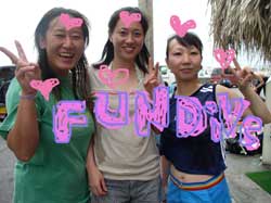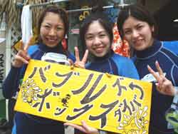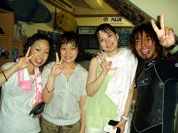 こんんちわ☆かのこです☆偶然同じ東京からお越し2チームようこちゃん&あきこちゃん・あけみちゃん&ともこちゃんです!!みんな、ダイビング経験者☆説明も復習程度に抑えて、いざ海へ!!!!海は、生憎のコンディションなんですが・・・洞窟は人がいっぱい(;_;)でもでも、お魚は熱烈歓迎!!!フユフユと波に揺られながら洞窟の中でリラ〜クス><お魚さんにもいっぱいエサあげましたね☆☆今度は、一緒に潜りましょうね♪♪ |