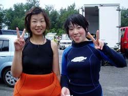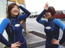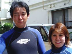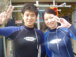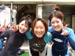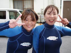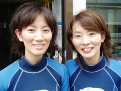 はい〜ダム二発目です!!千葉県から遊びに来てくれた祥子ちゃんと智子ちゃんのお二人です。祥子ちゃんはライセンスを持っていて智子ちゃんはボディーボードをやっているいう事で全然普通に潜れましたね☆水中ではイカが怪しい行動をとっていて、岩の下に出たり入ったり・・・。なにをしていたのか!?と気になったときに横から水田店長が現れ岩をひっくり返すと白いキラキラの卵が出てきたのでした。っという事で智子ちゃんもライセンスをゲットして二人でまた潜りに来てね〜☆ |