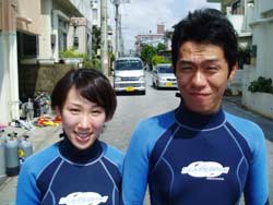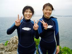 本日最後の体験ダイビングは長崎から一泊二日の強行旅行で遊びに来てくれた陽子さんと寿枝さんです!!緊張してますか〜??って聞いたら「あっ余裕ですよ」っと自信満々の返答が返ってきた二人でしたが、その言葉どおりに水中の中にもあっさり入り、魚達とすぐお友達!?になってましたね!!そのほかにもソフトコーラルを触ったりナマコを触ったりと水中を満喫してきました☆また沖縄に来たときには遊びに来てくださいね!! |