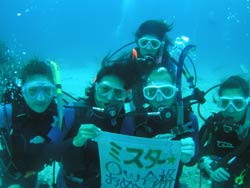 こんにちはぁ。今日は昨日から引き続きFUN&体験ペアのターキーさん&クミさん。Oさん&Mさんと一緒にケラマへダイビングをしに行って来ました!!クミさんは3日連続、Mさんは昨日からの連続のダイビングということで2人共とぉ〜っても上手♪2人とも相方のターキーさん&Oさんに手を引かれながらほのぼの、とぉっても楽しそうに泳いでいました!!そして4人ともガッツリ3DIVE!たくさんの魚の中を泳いだり、サメを見たり、穴をくぐって地形を楽しんだりとFUNダイビング並みの遊びをしてきちゃいました!!この流れでクミさん&MさんはライセンスGETしちゃって、次はターキーさん&OさんとFUNダイビングをしましょう♪待ってまぁす☆☆ |