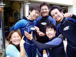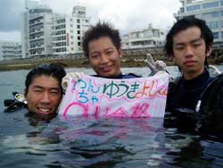 まいど〜ひろあきです!!今日はとっても元気な5人組が遊びに来てくれました!みんなダイビング初めてだけど、とにかくのりのりで気分はもう海猿!タンクを背負ったら早速腕立てやってたよね(笑)海も全然余裕でガンガン泳ぎまくっていました。観音様の掃除をしていたら、いつの間にかターゲットが変わってたり水中でのラブラブシーンありととにかく笑いが耐えないダイビングでした。この後は洞窟スノーケルに行ってきま〜す!! |