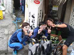 じゃーん今日は仲良し吉本姉妹みっちゃん&ひろちゃんとの体験ダイビング〜!ちっちゃくって細い2人なんですが、けっこう力もち!10キロのタンクをひょいって背負って海へ!顔をつけた時からカワイイ魚がよってきたね。チェーンをグイグイしながら、あっという間に水深9メートル!2人ともなかなか上手だぞ〜。スイスイ泳いで、ニモの家族のお家に到着。ミニミニの赤ちゃんニモがとーってもかわいかったね!クロ+白+黄色のギルも発見!海のクリスマスツリーはピュってひっこんじゃったね!最後はふわふわ空を飛ぶようにおよいでみました。本日のダイビングはいかがでしたか?いつか、姉妹でライセンスゲットもいいかもよ。 またいつでも遊びにきてね〜(^^) |