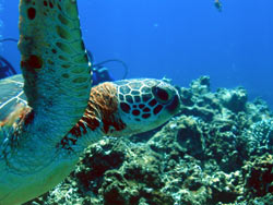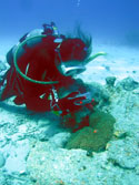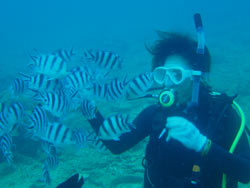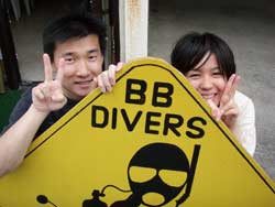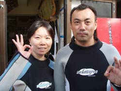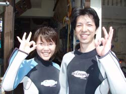 こんにちわぁ〜♪本日11時〜は、東京から来てくれたさわやかな平野さんご夫婦、たいきさん&ゆみこさんでーす。説明⇒着替えを済ませ海げGO!浅瀬での練習してさぁ〜いよいよダイビング〜。少し泳ぎ進むと、もうお魚わんさか。エサをあげると。自分達のまわりは魚だらけ〜。そして、『ニモの家族』のいるイソギンチャクに到着〜。ちっちゃな赤ちゃんニモとっても可愛かったですね。ぴゅって引っ込んでしまう、『クリスマスツリーワーム』や『ギル』や大きな口をあけて泳ぐ『グルクマ』もみました。初めてのダイビングはどうでしたか?お2人と潜れて楽しかったでーす。また是非是非遊びに来て下さいね。体験ダイビングでも、ライセンスコースででも、いつでもウェルカムですよ〜。 |