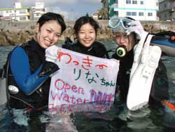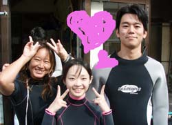 こんにちはぁ☆今日は、一昨日からOWスクールを頑張ってきた元気な大学生。わっきー&りなちゃんの最終日です!!昨日までに頑張ってスキルを終わらせてきたのでさっき沖縄に着いたばかりの千葉ちゃんも一緒に砂辺でFUNダイビング★ナマコで遊んでみたり、振り向くとりなちゃんがソフトコーラルに埋もれてたり、なんだか笑いっぱなしのダイビングだったね(^^)そして、今日でわっきー&りなちゃんはOWダイバーでぇ〜す!!!おめでとぉ〜☆&お疲れ様でした♪これからもどんどん潜って水中世界をいぃ〜っぱい楽しんでね!!また一緒に潜りましょうね♪ |
