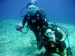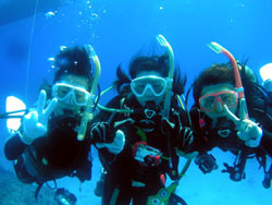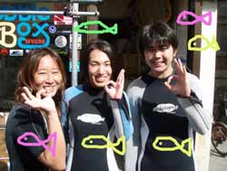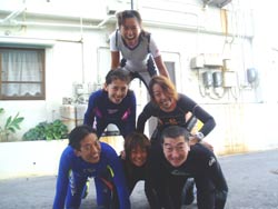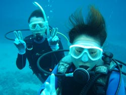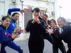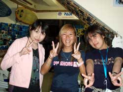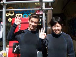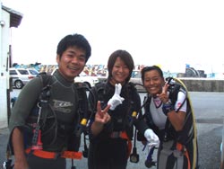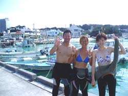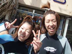 1時30分からの体験ダイビングは大阪から来てくれた美容師さんお2人、本ちゃん&みきちゃんでーす。2人とも初めてのダイビングですが、はじめから上手!スイスイ泳いであっという間に水深9メートル!お魚にエサをあげたり、水中写真をとったり、やわらかいサンゴに触ったり、水面のキラキラする光に見とれてみたり。最後は、細い穴をくぐりぬけたりもしちゃった。沖縄の海の中はどうでしたか?沖縄1年中もぐれますよ〜。またいつでも遊びに来てね〜。ライセンスゲットにも挑戦してみては??またんめんそ〜れ〜。 |