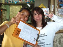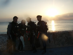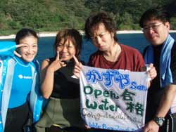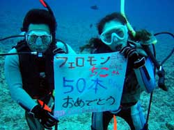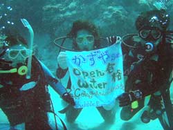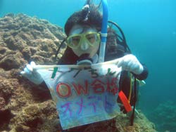 本日新しくダイバーが誕生しましたぁ〜! ふみちゃんオープンウォーターダイバー合格でーす!ひゅーひゅ〜。まったく初めてのダイビングで器材セットから、海の中でのスキル、学科まで、よくがんばりました。マスク脱着もガッツでのりきったね!えらいぞ〜。でもラストチェックで、マスクに水を入れた時のクリアするの余裕だったね。よしよし、よく育ちました。マンツーマンのスクールでしたが、最後のダイビングの時。のりちゃん率いるかっこいいfunダイバーの面々と遭遇し、みんなに、合格祝いをしてもらいました。funチームのみなさんありがとう!!ふみちゃん!これからもいっぱい、ダイビングを楽しんでね!沖縄にも遊びに来てね〜♪そして、プレゼント&メッセージ受け取りました。ありがとう!とってもうれしかったよん(^^)優しいお心づかいありかとう!また一緒に潜れる日を楽しみにしてるよ。またんめんそ〜れ〜。 |