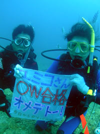 じゃんじゃじゃぁ〜ん!本日2人のダイバーがタ誕生しましたぁ〜。ヒューヒュー!パチパチパチ〜!ウマを愛するナイスガイ石黒さん&見えないけど、実はママゆきこさんでーす。まずは、午前中にお勉強をやっつけて、昼からの1ダイブ目で練習をどんどここなし、ラストダイブは上手になりながら、いっぱい遊びました。フィンの使い方や、難しいと言われている、中層でとどまるホバリングもずいぶんコツをつかんで、2人とも楽しみながらスイスイ泳いでました。なかなかカッコよかったよぉ〜。本物のニモのおうちにいったり、ソフトコーラル(やわらかいサンゴ)の花畑の上を泳いだり、大きなウツボを発見したり。サイゴは細い穴も上手に抜けましたね。ライセンスコースはいかがでしたか?お勉強&海の練習で大変なこともあったかもしれないけど、今日で合格!ダイバーです!これから、ダイビングをどんどこ楽しんでほしいです。2人と潜れて楽しかったよ〜。また一緒に遊ぼうね〜。またんめんそ〜れ〜。 |