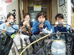 今日は、新潟県から☆郁久子ちゃん☆美穂ちゃん☆梢ちゃん☆豊田さん☆が遊びに来てくれました!!みんな、ダイビング初めてという事☆少し緊張気味・・でも、ゆっくり練習すれば、ばっちりだったね!!みんな、水中でもしょっちゅう笑ってたね(笑)☆ニモ☆も見れましたねぇぇ〜!!海のなかはいろんな魚でいっぱいでしたね♪エサ、あげた時もすごかったでしょ!?ぜひ〜みんなでまた沖縄に遊びに来てくださいね!!みなさん♪せっかくなので次はライセンスにも挑戦してみて下さい!!すごい上手だったからね!!取らなきゃ損!!また、遊びに来てねぇぇ〜♪おまちしてまぁぁーす★ |