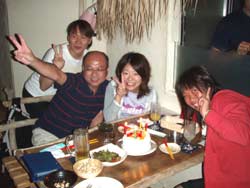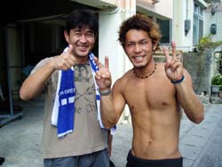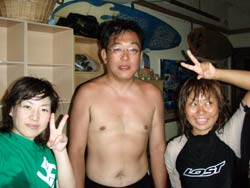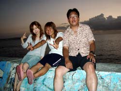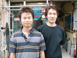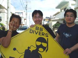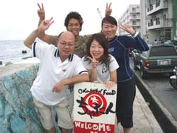 本日午後から飛び入りダイビング〜♪東京から到着の宗像くん&沖縄在住黒田さんです。まぁ平たくいうと。ダンナと、ダンナの波乗り仲間のムナくんです。沖縄サーフトリップで遊びにきてくれましたが、波がないため。ダイビングという事になりました。初めてのダイビングなのに非常に上手い!MY水中カメラで写真をとりながら、スイスイ泳いでました。エサをあげるとわっさーとサカナがよってきました。本物のニモともご対面!ちいちゃな赤ちゃんニモもいてとってもかわいい〜。でっかい男、2人は、ちっちゃなニモをやさしい目で眺めていました。沖縄の海の中はどうでしたか?また遊びにきてね。沖縄滞在中にいい波もやってくるといいですね。(オンショアでもなく。。)そうだ。しんちゃんまんじゅうご馳走さまでしたぁ〜。 |