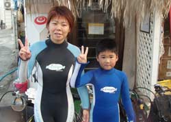 本日朝一番のダイビングは、ゆきこさん&ゆうやくん(8歳)♪かっこいいウェットスーツに着替えてさぁ〜ダイビング。お口でスーハー息をして。お鼻をつまんでチーンって耳抜きもできて、たくさんのお魚をみれたね。シマシマのお魚がいっぱいきて、少しビックリしたゆうやくん。でもニモにでてくるキャラクター黄色と白と黒のギルを発見!本物のギルを見れたね〜!すごいぞ〜。次は本物のニモに会いにいこうね。また遊びに来てね〜。 |