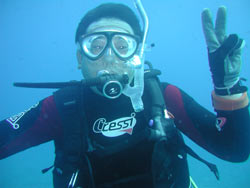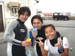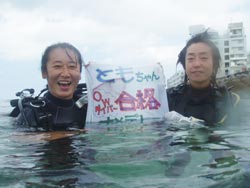今日はめでたいぞ〜。なぜなら〜。新しくダイバーが誕生したからでぇ〜す。白石智子さん本日オープンウォーターダイバー合格でーす。わーいわーい!3日間とってもよく頑張りました。でも1ダイブ1ダイブどんどこ上手になるともちゃん。マスクに何度も水を入れさせられた初日。メンタマはかなりしょぼしょぼ、しょっぱかったはず。。2日目は、スキルを順調にこなし。今日は余裕も潜りっぷりです。浮力調整、スキルチェックも問題なし。今日からダイバーです。おめでとーー!午後からは、お祝いビールをがぶがぶするともちゃん&りょうちゃん。いや〜うんまい!ともちゃんと潜れて楽しかったです。また沖縄に遊びに来て下さいね。次はウニ(白ヒゲウニ)がくっつきますように。。(^^) |