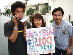 はーちゃん&わかちゃんの体験ダイビング〜♪本日の砂辺はやや波ありで、体育会系のダイビング、海猿風でしたが、2人ともガンガン泳ぎ進みあっという間に水深8メートルの海底に。エサを出すとお魚がいーっぱい寄ってきました。ビー球みたい海草『オオバロニア』ややわらかいサンゴ『ソフトコーラル』や、おいしくないウニなんかもみました。そして、水中で、はーちゃんのお誕生日をみんなでお祝いしましたぁ〜。はーちゃんハッピーバースデー!2人ともとっても上手だったので、ライセンスゲットも挑戦してみては?今日は一緒に潜れて楽しかったです。また是非是非遊びにきねて〜。 |