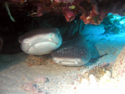 サメェェェー!!いっぱぃ見ました!!今日は☆あいこちゃん☆加藤さん☆さっちゃん☆と一緒に潜ってきましたよぉぉ〜!!少々・・・・波が高くケラマまで行けなかったですが。。。チービシ☆神山島〜ラビリンス〜楽しかったです!!穴という穴をくぐりまくりましたね♪♪そして、穴をのぞこーとしたら・・・穴からネムリブカさんのシッポが2つ見えていて・・・のぞくとさらに2匹いて・・・サメがかさなりあいーのひしめきあっていました!!2本目では、「さぁ〜くぐろう!!」とした穴のど真ん中に・・・ネムリブカさんが1匹寝ているではありませんか????通ろうか・・通らないか・・悩んで悩んで。。。どーしても通りたかったので、通っちゃいました♪♪正直ドキドキしまくりでした!!何度、誰かに先通ってもらおうかと・・考たことか(笑)私が、通るとネムリブカさんは泳いでどっかに行っちゃいました。。浅い所にも、サカナがいっぱぃ群れててキレかったですね♪♪今日は、ケラマには行けなかったケド・・・2DIVE楽しかったですね♪♪透明度もよかったし♪♪また、みなさん一緒に潜りましょー!!&ケラマに次こそは行きましょーね!! |