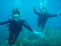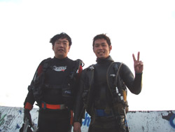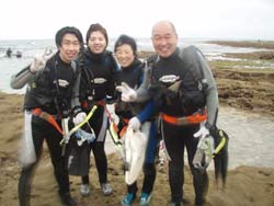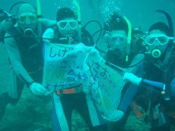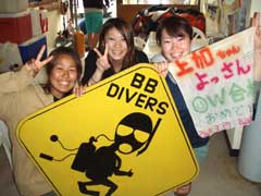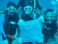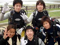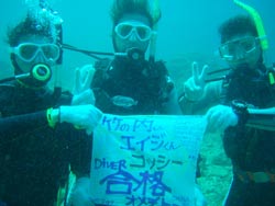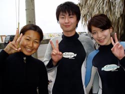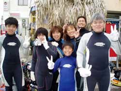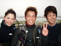 はいさ〜い!!今日も、新たなDIVERの誕生です!!仲良し夫婦☆2組若島さん夫婦★しげちゃん&さっちゃん★はまもとさん夫婦★まいさん&いさおさん★一昨日から、3日間がんばってきました!!波にも、寒さにも負けず頑張りました!!みんな、最初は中性浮力がなかなかつかめずに・・・浮いたり〜沈んだり〜してたけど。。最後のラストDIVEは、完璧でした!!みんな、かなりイイ感じに中性浮力とって泳いでましたよ!!肺の使い方も、だいぶマスターしました!!この感覚を忘れなければ大丈夫です☆そして、最後に水中合格式で・・・OWダイバーの誕生です★★おめでとぉーございます!!3日間おつかれさまでした☆これからも夫婦、仲良くいろんな海を潜って、楽しんでください(>。<)!!また、みなさん遊びに来てくださいねぇぇ〜♪楽しみにまってます!!また、一緒に潜りましょうねぇぇ〜♪♪ |
