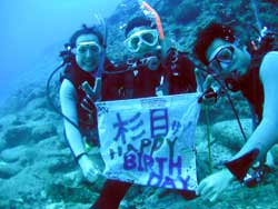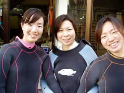 午後からの体験ダイビングのメンバーは、いい人が多いといわれる総武線エリアから来てくれた元気な女のこ3人組♪かなちゃん&みほちゃん&まみちゃんです。昔からの友達という事でとても仲良しの3人です。そういう友達っていいよね〜。みんなはじめてのダイビングで海の中で笑えるドラマがあったね〜。でもでもみんなバッチリ耳抜きも呼吸もできて、本物のニモにご対面できちゃいました。たっくさんの魚に囲まれたり、水中写真をとったり。初めてのダイビングはどうでしたか?3人とあそべてとっても楽しかったよ〜。またいつでも遊びにきてね。これからも友情とカナちゃんのアダルトサンダルを大切にね〜♪ |