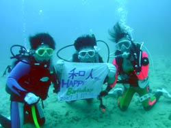 こんにちわぁぁ〜♪♪今日の体験ダイビングは仲良し4人組☆るみちゃん☆なおきさん☆ひらちゃん☆さとしくん☆です!!みんなで頑張って潜りましたよー!!お魚にエサをあげて〜なまこを触って〜ニモを見たりしましたね♪♪るみちゃんは、いつも「ニコニコ」してて、とても上手に楽しそうに潜っていましたね♪みなさん、次は。。ぜひぜひライセンスに挑戦してくださぃ!!また、ぜひ一緒に潜りましょうねぇぇ〜♪♪まってまーす!! |