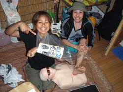 今日は早起き大好き?ニコニコマッキーのEFR講習でーす!外人が出演してて吹き替えの「ビバリーヒルズ」のようなビデオをみてから実技開始!きちんとメモをとる良い生徒です。レスキュー呼吸やCPRの流れ、チョーキングの対応などなどを練習。マミの左腕骨折の想定で、周りにあるものを自分のアイディアで利用しようという事で、おおきなゴミ袋を三角巾代わり、雑誌を副木にして、対応してもらいました。かなりいい感じに固定でき。まみもこの笑顔→。これでまた、たよれる男にみがきをかけたマッキーであります。EFRのあとは。1ダイブ!波や流れのある海ですが、そこはガシガシおよいじゃいます。アカククリの幼魚やウミウシ。水玉サンゴの昼バージョン&夜バージョン、そしてサヨリの大群もいました。明日からはレスキュ〜講習!ファイト!オー!! |