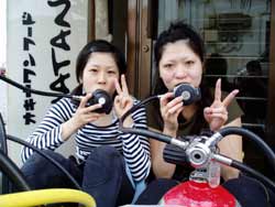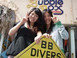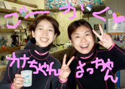 こんにちはぁ☆今日、朝から体験ダイビングをしに来てくれたのは今日ケラマに行っているヒロさんのお友達のお友達。ミーコちゃん&陽ちゃんです!2人共ダイビングは初!!とのことでしたが水面でゆっくり練習をしたことで2人共すぐに水中世界を楽しんでいました!顔が隠れるくらいたくさんのシマシマのサカナにエサをあげたり、ニモを見たり・・・時間が過ぎるのは『あっ』と言う間だったね★次はみぃんなでケラマへ行きましょう!また遊びに来てねー(^^) |