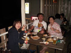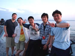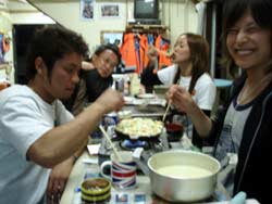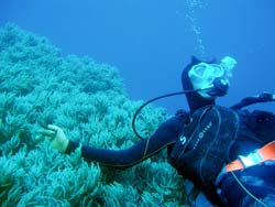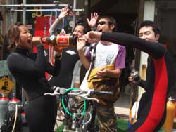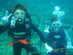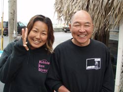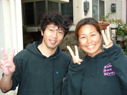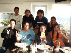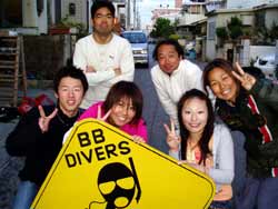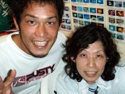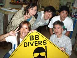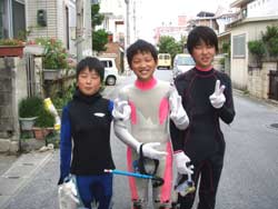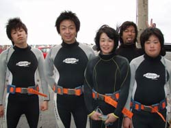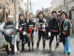 午後3時からはチームドラッグストーン??の体験ダイビング〜♪かなーりファンキーなノリのいい6人組み。う〜んみんないい味出してるぅ〜ん!メンバーはミズタマンまきちゃん&ヨウスケくん&ともくん&かずくん&ストーンいっ平くん&サトピ〜〜です。説明→着替え→練習を済ませいざ海へ!波がややありましたが、デキル面々チェーンをガシガシつかんで進みます。あっという間に水深8メートルの海底に到着!サカナにエサをあげたり、写真をとったり、本物のニモに会ったり、さらにデッカイ、イカがごろ寝??してたり。。初めてのダイビングどうだった?みんなすんごーく上手だったので、マジでライセンスとっちゃって下さい!あっ、Tシャツも大事にしてください。!みんなと潜れて楽しかったよー!また遊びに来てねー!またんめんそ〜れ〜! |