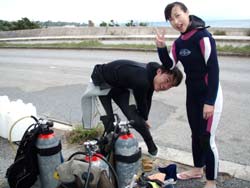 まいど〜ひろあきです!!今日は午後から体験ダイビングを担当しました★遊びに来てくれたのはマコトさん&ワカコさんです!!若干ワカコさんが緊張気味で水があんまり好きではないとのこと・・・。しか〜し、しっかり説明&練習したらもう全然ばっちり水中に入れちゃいました☆餌付けをしてナマコを生手で触ったり←(気持ちよかったみたい)ソフトコーラルを触ったり←(あんまりだったみたい)とにかく水中を満喫しましたね!新しい感覚だったでしょ〜?また沖縄に来た時には是非遊びに来てくださいね☆★ |