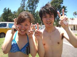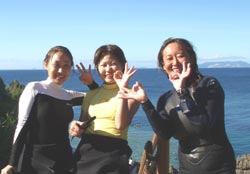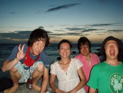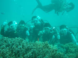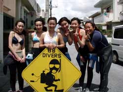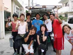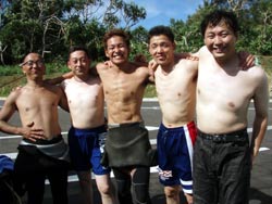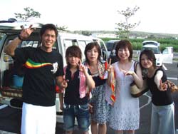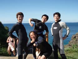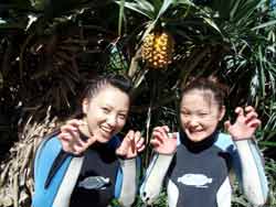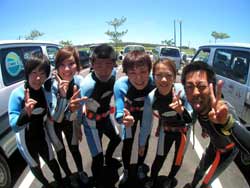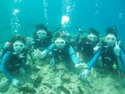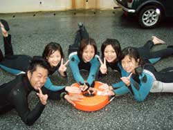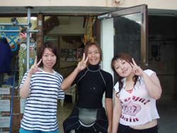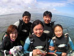 13時からの体験ダイビング〜♪元気、でナイスキャラの女の子5人組みでーす。ゆきこちゃん&まきちゃん&みさこちゃん&あやこちゃん&まりこちゃん。5人は大学のお友達、お酒もお好きだそうで〜す♪そうだ、女は酒だ!?!?今日の真栄田岬の海は湖のようにおだやか、絶好のダイビング日和! 海の中もお魚いっぱいです。餌付けをしたり、ニモの仲間のクマノミをみたり、水中写真をとったり、健太郎の一発芸!バブルリングも見事だったね。そして、元気いっぱいの5人は、次に洞窟スノーケルにも挑戦!みんなすいすいすいーーって上手に泳げてました。少しくらーい洞窟の中だったけど、青い光に癒されたね。帰りは、エサをわけわけしながら、餌付けしたり、素潜りに挑戦したり、いやぁ〜今日はよく遊んだね。このあとも、ちゅらーゆ、海ブドウどんぶりにタコライスと、5人のスケジュールはまだまだ続くようであります。今日はみんなとワイワイ遊べて楽しかったよ。また遊びにきてね。たとえ1泊2日でも(^^)またんめんそ〜れ〜♪ |