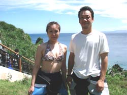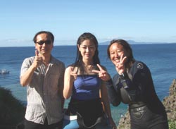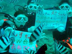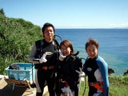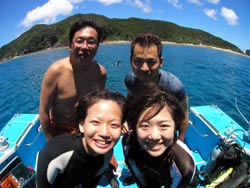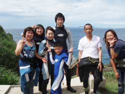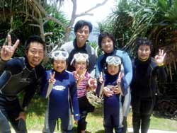 今日結婚式を午前中にあげた新婚さん 利治さん&珠恵さん そしてそのご家族、文語パパ、のり子ママ、聖恵さん、宏明くんが遊びにきてくれました。インストラクターのような楽しいパパを筆頭に仲良しなステキなご家族です。良いお天気の真栄田岬で元気に遊びました。洞窟の中のブルーの光、とってもキレイでしたね。カラフルなお魚もいーっぱいよってきて、みんなで餌付けもしました。沖縄の海の中はいかがでしたか?楽しいご家族と遊べて、私たちも楽しかったです。またいつでも遊びにきてくださいね。 |