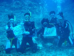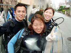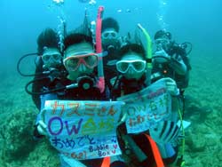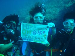 まいど〜ひろあきです!今日も愉快なダイバーが誕生しました☆★うどんの国、香川県から来てくれた仲良しご夫婦のけんちゃんとまさちゃんと純沖縄人のしずちゃんの三人です☆みんなダイビングは初めてという事で3日間のコースで開始したんですが、初めてのダイビングにどきどきして呼吸&耳抜きに手こずったけど、ゆっくりゆっくり慣らしていったらどんどん上手になっていきました。スキルもやっていくうちにコツをつかみましたよね!学科は二日間目に最終テスト!!運命の瞬間・・・。全員合格です☆★☆★みんなホントにホッとした表情でしたね(笑)そしてラストダイブ!3日間早かったですね!セッティングも完璧!見たかったニモもみれました。そして抜き打ちラストスキルも楽勝でクリアして見事オープンウオーター合格です!!おめでと〜〜〜〜パフパフパフパフパフ〜〜〜〜!!しかもけんちゃん&まさちゃんの結婚1周年記念日&けんちゃんの2○才の誕生日も祝いました★ホントにみんなお疲れ様でした。また一緒に潜れる日を楽しみにしています!みんなからの寄せ書き涙がちょちょぎれそうでした(笑)ありがと〜!! |
