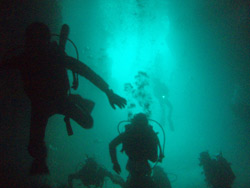 今日のスペシャル体験ダイビングは三好さん夫婦と岐阜から遊びに来てくれた小池君とりえさんです。4人ともとっても上手に泳いでいましたよ。−30mを見下ろしながら するるーの群れをじっくり眺めながら顔より大きなツバメウオに指を噛まれたり、魚もいっぱい見れてよかったです。肺での浮き沈みを理解して小池君とりえちゃんは2本目スペシャル洞窟体験ダイビングです。いや〜蒼かったね!のんびり洞窟で海の蒼さを確かめたあとは ヒトデや ミナミハコフグの幼魚など洞窟の入り口にいた 幼魚の群れもすごかったですね。次回は ライセンスに挑戦してもっともっと楽しいポイントに潜りに行きましょうね!沖縄の青い海で待ってるよ〜! |