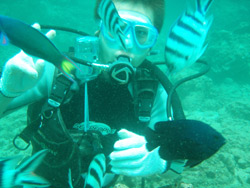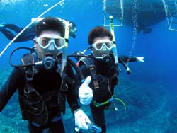 1.00〜今日の2人目のスペシャル体験ダイビングは、大分から遊びに来てくれたゆかりちゃんです。以前BBで洞窟シュノーケルに参加してくれた。とっても可愛い女の子です。初めてのダイビングでしたがゆっくり説明して浅い所で練習 メキメキ上手くなっていました。最初はドキドキして呼吸が上手く出来なかったようだけど コツをつかむととっても上手くなって ライセンスを持っている人と同じように 泳いでいましたよ!2本目は 以前シュノーケルで行った洞窟スペシャル体験ダイビングは 50分以上の超ロングダイブでした。これまた青い光がとってもきれいでしたね。コレなら次回ライセンスゲットは 間違いないでしょう〜〜また 沖縄の青い海で 待ってるぞ!! |