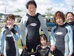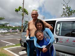 岩崎パパ&ママ&みちこさん&ゆかちゃん&双子のみほちゃん&みなちゃんのぷち体験ダイビングです。いや〜ふたご姫のみほちゃんみなちゃんは8才なのに ドンドン自分で泳いでいました。おねーちゃんのゆかちゃんもドンドン慣れて来て最後は一人で潜っていました。パパママは皆よりちょっと先に練習して 一人で泳げるようになってとっても上手かったですよ。みちゃこばーちゃんもりょうこさんとマンツーでがんばりました。皆魚いっぱい見れてよかったですね!いい思い出になったかな?大きくなったらまた 沖縄に遊びに来てね! |
