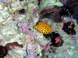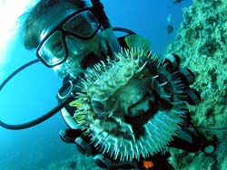 本日午後から、くみちゃん&イトマサさんとファンダイブ〜♪まずはツバメの根ポイント!キラキラのキビナゴにかこまれながら泳ぎ進むと。でっかいタコを発見!うーんおいしそうだなー!頭の上をピクピク動かすハタタテハゼはとってもキュート!岩陰にウツボもいましたね。2本目洞窟ポイントへ。とーってもきれいなアカテンウミウシや、超人気のミナミハコフグの幼魚も発見!クマノミのタマゴも観察できました。洞窟のブルーに感動です。3本目は「チームビリー」西塔さん、原さん、白きちくんとのダイビングの予定でしたが、なんとシェリー役として久美子ちゃん飛び入り参加!よっしみんなではりきってGO!マンボウみたい形のツバメウオやハリセンボン、ミノカサゴクマノミファミリーをみながら、洞窟に到着!洞窟内には、リュウキュウハタンポの群れがみごとでした。洞窟で浮上したら、カレーの香!?やキャバブルー!?などのネタで盛り上がり、みんなで協力しあって、洞窟の光るブルーの撮影に成功。安全停止中にビリーポーズの撮影があったり、本当にノリの抜群なメンツです。ビリーチーム実は社員旅行。もぐり終わって急いで那覇へ。(遅刻っぽいけど、)シェリーことくみちゃんは、一緒にビールのみながらログタイム。いやー良く遊びました。みんな今日はグッスリだろうな。また遊ぼうね。 |