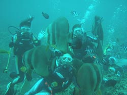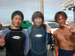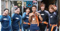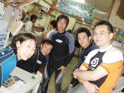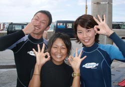 はいさーい!!あかねでーす♪♪今日は〜砂辺で体験ダイビングです!!11時から遊びに来てくれたのは☆カオルちゃん・エリコちゃん・ミホちゃん・俊輔くん・雄一くん☆です!!みんなダイビングに初挑戦です!!最初は少し緊張気味。。でも、水中に入っていざ潜っていくと・・・海の中ではみんなかなり上手に自由奔放に遊んでました(笑)!!みんな笑顔でニコニコ♪♪水中で、サカナにみんなで餌付け!!たっくさんサカナ集まってきたね♪♪そして、本物のニモ☆かわぃかったですねぇぇー!!みんな☆すごく上手だったから☆次は、ぜひライセンスに挑戦してみてください!!また〜いつでも遊びに来てくださいねぇぇー!! ひろあき&りょうこチームは5名貴子さん・千尋さん&栄祐さん・仁美さん&のっぽくん。みんな始めから上手で、楽々海底へ。お魚にエサをあげたり、ニモのおうちを訪ねたり。。ニモファミリーの中には、ちっちゃな、ちっちゃな赤ちゃんニモがいて、超〜かわいかったですね。そしてCコースののっぽ君こと寺西康広くんは更にもう少し遠出して、やわらかいサンゴを触ったり海のツリーであそんだり、へんてこ命写真をとったり、海中クイズ(正解は2番?)もしてたっぷり遊びました。みんなまた是非是非遊びに来て下さいね。またんめんそーれー。 |