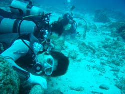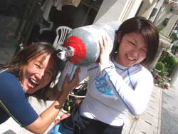 13:00〜の体験ダイビングは機動隊員のシンヤさんとともこさんです!!しんやさんは遊びのダイビングはないまでもいつも訓練を受けているのでもちろんかなり上手☆でもともこさんは初めてでかな〜り緊張気味・・・。水面ではこわばった表情でしたが練習を続けると次第に笑顔に変わっていき最後には二人仲良く手をつないで泳いでいました!今度はライセンスとりに来てくださいね!!待ってますよ〜!! |