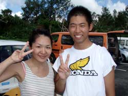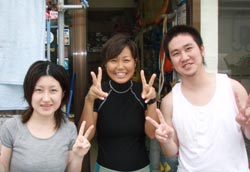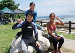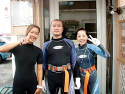 お昼からの体験ダイビングは仁美ちゃん&沙耶香ちゃん&めぐみちゃんの九州っ子三人組と間違えて違うバスに乗っていた(笑)雅市くん&千恵ちゃんです!!説明を始めようとするとなぜか豪雨が・・・。荒れた天候でしたが、真栄田岬裏ビーチは穏やかでのんびり魚を観察できました!!青いルリスズメダイやシマシマのロクセンスズメダイは可愛かったでしょ〜?また是非遊びにきてくださいね!! |