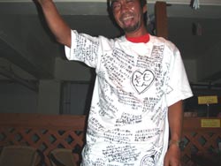 葵ちゃん&あおいちゃんのお姉さんみゆきちゃん&お姉ちゃんの彼ヒロノブくんとのダイビング〜!嵐を呼ぶ女??がいるのかいないのか、エントリー前にごっつい雨が!!でもウェットスーツ着てたらそんならへっちゃら!と元気なメンバーです!いいぞーー!海の中もとっても上手、呼吸も耳抜きもスーパー上手!かわいい〜ニモもみちゃいました。そしてあおいちゃんがこっそり用意してくれた、サプライズハンカチに感動!かわいいクマ(ミッキー)のイラストも描いてありました。ナイスキャラの3人と遊べてRYOKOも楽しかったです。またいつでも遊びに来てね今度は、食べすぎに注意して、洞窟もいけるといいね。またんめんそーれー! |