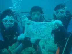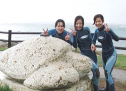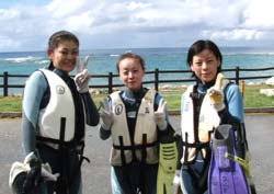 幸恵ちゃん・さなえちゃん・未幸ちゃんと じょん万ビーチへ体験ダイビングです。ここはカメの産卵で昔は有名だったのだけど、最近はカメの上陸も少なくなっているそうです。みんな〜〜ゴミを捨てないようにしようね。とっても可愛くて 元気な3名は コツをつかむのも速くわいわいと水中散歩を40分以上も楽しめました。小さいけど青い魚やシマシマの魚などが いっぱい寄ってきてくれて 可愛かったね。次回はお花畑のサンゴを見せてあげたいな〜〜また 沖縄に来た時は挑戦してみて下さいね。3人ならもっと深いところまでいっても大丈夫だよ〜! |