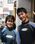 今日の体験ダイバーはじゅんくんとりさちゃんです。二人ともとっても上手でした。じゅんくんなんかは ライセンスを持っているのってぐらい自分ですいすい初めから泳いでいてびっくりです。本当に今回はじめての体験ダイビングだったのかな?海ではニモの家族に会いにいったり 餌付けですごい量の魚に驚いたり、珊瑚前で写真撮影などなど ちゃんと写真撮れたかな?いいのがあったら お店で飾るので送ってね。次回はライセンスにでも 挑戦してみて下さい2人なら楽勝だと思うよ! |