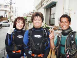 まいど〜ひろあきです!!今日は朝から太陽が顔を出してくれてぽかぽか陽気☆そんな中ケラマへ行ってきました〜!!今日のメンバーはOW講習最終日の、はたけ&つっちー☆★そしてまりっぺの三人です!!!ちょっと北風の影響で船は揺れたけど無事ポイントに到着!!初めてのボートからも三人ともかっこよくエントリー!!今日は「トウマ」「アリガーケーブル」「ドラゴンレディー」の3ポイントで潜ってきました!!みんな砂を巻き上げないように必死に中性浮力をキープ!!そのおかげで潜るたびにきれいに泳げるようになっていましたね!!たっくさんの海のアイドル達に逢えてお腹いっぱいになりましたか!?ということでスキルも全て終了して晴れてオープンウオーターダイバー合格です!!!おめでと〜〜〜〜パフパフパフパフパフ★☆★☆★☆これからもステキな海がたくさん待ってますよ!!また一緒に潜りましょうね!!! |