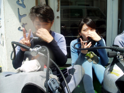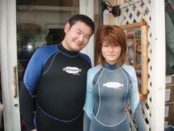 まいど〜ひろあきです!!本日最後の体験ダイバーは千葉から遊びに来てくれたリョウスケ君とメグミちゃんのお二人です!!二人とも初めてのダイビングでちょっと緊張気味で色々な質問があったけど、練習すると全然余裕で水中世界へエントリーできました★☆やわらかサンゴやニモなど水中に生息するたくさんの生き物を身近に観察できました。今度は是非ライセンス!!お待ちしています☆ |