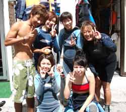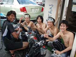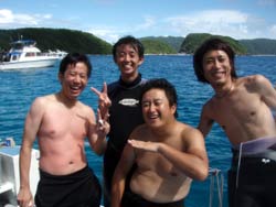 21歳男子チ〜ム康正君、翔吾君、拓也君、仁光君の4人組で来沖です! 計画性があるのかないのか、やる気はあるのに当日朝の申込だったり、リーダー不在の不思議なグループ。その割には互いを思いやるトークが普通に出てくるという かなり好感度の高い4人でした。泳げないストレスや耳抜きに苦労した人もいましたがしっかりスナベの海を堪能していただけたようですねー。ダイバーにならないなんてもったいない位の人もいました。また沖縄の海でお逢いしましょ〜! |