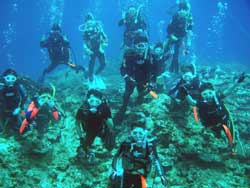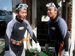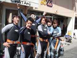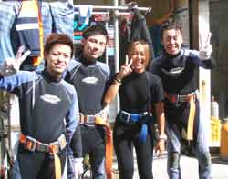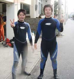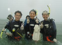 OW3日目ラストダイブは、石神ちゃん、近藤ちゃん、きんちゃんの3名ダイバー仲間入りおめでとう〜!きんちゃんは 独身最後の一人旅ダイビングのライセンスをゲットもおめでとう〜次回は嫁と一緒に遊びに着てね。石神先輩は水泳部だけあって かなり水慣れしていて スイスイととっても上手で驚きました。これからもガッツリ潜ってかっこいいダイバーめざしてね。近藤後輩さんは、陸でも海でも少しぼーってしていたけど ポイントはつかんでいました。それにしても 3人ともとって上手で 久しぶりにフィンを外して月旅行体験をしましたが これからは もっともっと海、魚、仲間と楽しんで下さいね。また 沖縄の海で待ってるよ〜!次回はケラマに行こうね。 |