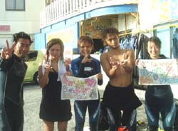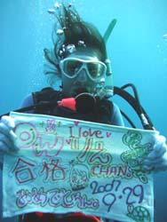 愉快な仲間がやってきたーー!ビーカーマニアちあき&わりとイイ人まきちゃん&鼻芸プロみゆきちゃん&海アヒルえろっちです。朝から。先週誕生日だったエロッチは、偉い!?人にダイブマスターの特訓をうけ。昼からみーんなでジンベイくんのどら焼きタイプの網にからまり、ラストはおだやかーなスナベにて、たっぷりのロングダイブ!夜はみんなでワイワイ、宴会!今日も1日たっぷりよく遊びました。われらが、宇田川ちゃん、結婚したと聞きました。なので⇒(右写真)みんなのお祝いの気持です。おめでとーー!うーん私達の愛を感じるでしょう(^^)幸せにね。 |