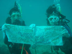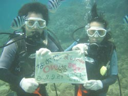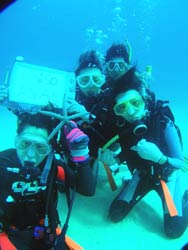 みかちゃん&ゆかりちゃんの体験ダイビングぅ〜!かわいい女のこ2名です。初めからスイスイ余裕の泳ぎ。お魚にエサをあげたり、ニモファミリーのおうちに行ったり。ニモはなんだか、パンツをはいているようにも見えました。。みかちゃんが教えてくれて、こっそり準備しておいた、サプライズハンカチを水中でぷれぜんと!ゆかりちゃんハッピーバースデー祝いの水中写真をとりました。沖縄の海はどうでしたか?また一緒に潜れる日を楽しみにしていまーす。 |