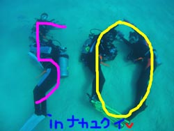 はいさーい!!あっかねでーす☆今日は恩納村にボートダイブしに行ってきました!!メンバーはあやさん☆よしさん☆さとみちゃん☆なほさん☆です!!今日のポイントは「ドリームホール」「ミニドリームホール」「ナカユクイ」です☆夢の穴はサイコーでした!!真っ青な出口にサカナのカーテン☆ミニの穴の方もキレイ!!ちっちゃなハナヒゲウツボの真っ黒幼魚君もいてかわぃかったですね!!そして、3本目は砂地でまったり〜♪♪沖縄の方言でナカユクイ〜♪一休みです☆そして、今日の3本目であやさんが50DIVEでーーーーす!!おめでとぉぉーございます!!50本記念に☆水中でみんなで50の人文字作成です!!陸でしっかり練習していった成果はあったかな!?ちゃんと50にみえるよね??50本おめでとーございます☆これからも、この調子でいっぱぃ潜って♪たくさん写真も撮っていってくださいね!!今日は〜1日お疲れ様でしたぁぁ♪♪地形ダイブ最高ですね!! |